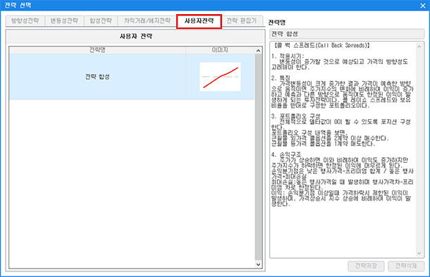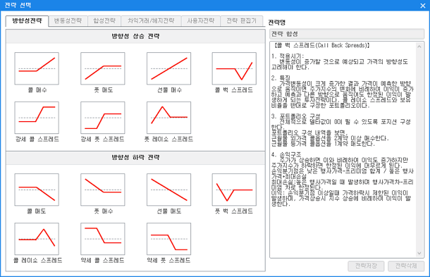 상세 전략의 리스트 (전략명과 전략별 만기손익그래프)가 제공되고, 특정 전략을 선택하면 해당 전략에 대한 상세한 설명문구가 나타납니다.