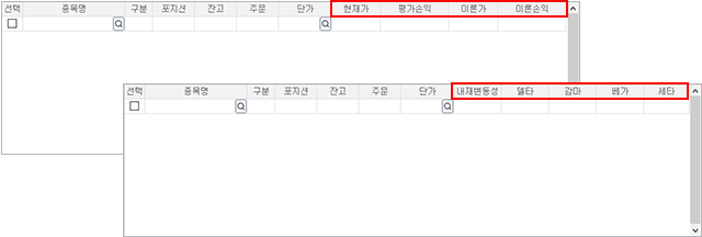 영역의 단가 칼럼의 값이 실시간으로 호가와 연동되어 반영됩니다.