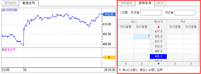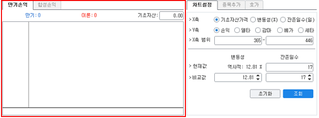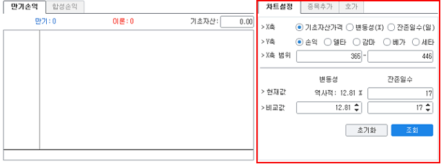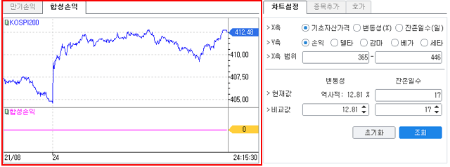 영역에서 체크표시된 종목들 전체에 대한 만기손익 및 다양한 시뮬레이션을 차트설정을 통해 수행할 수 있습니다.