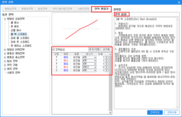 버튼을 클릭하면 '전략 선택' 창의 '전략 편집기'탭 화면이 팝업되어 전략을 편집하고 저장할 수 있습니다.