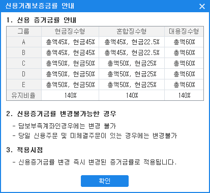 '신용거래보증금률 안내' 버튼을 클릭하면 '신용거래보증금률 안내' 창이 팝업됩니다.