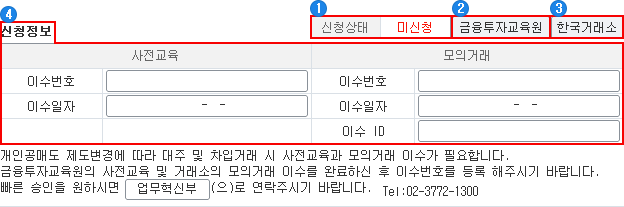 사전교육과 모의거래 이수 신청상태를 확인할 수 있습니다.